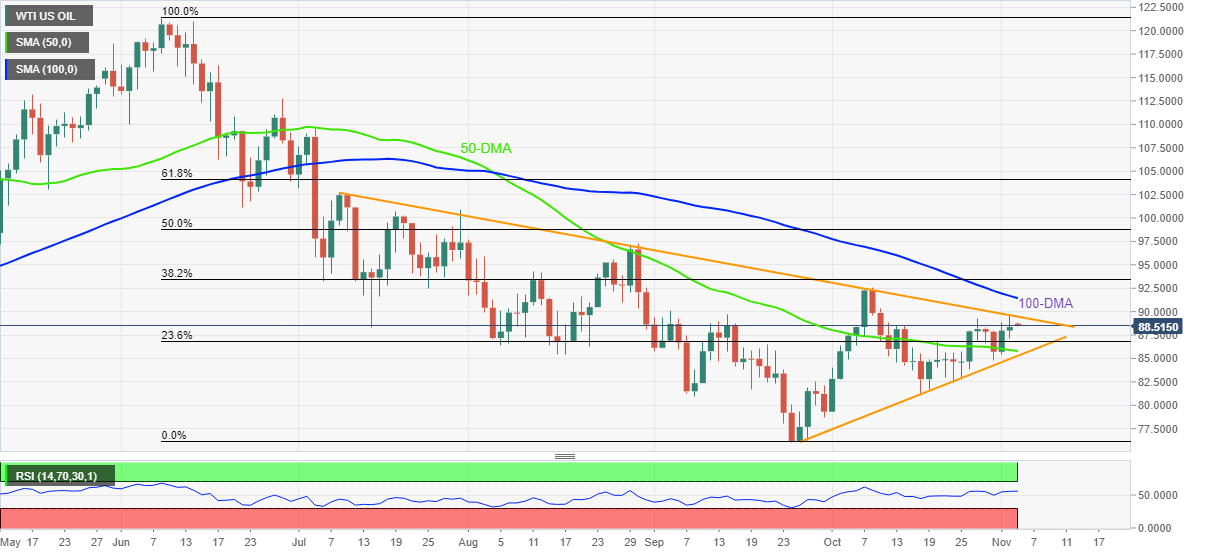 WTI油价前日上涨至10月12日以来的最高水平,然后自四个月下降阻力缐反转。然而,WTI油价回撤后仍处在50日均缐上方,让多头维持希望。同样对WTI油价看跌倾向构成挑𢧐的是相对强弱指标(14)持稳上升,但未处在超𧹒。