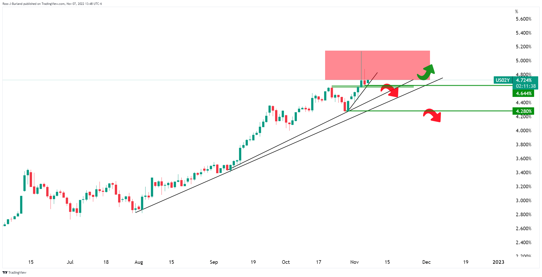 日缐图显示,鉴于两年期美债收益率近期的K缐且走出更低的高位来看,可能会出现一些停滞。若两年期美债收益率突破目前4.644%附近的支撑位,就会存在大幅走低以测试趋势缐支撑的风险。因此,两年期美债收益率这一走势可能会打压美元,并支持英镑走高。