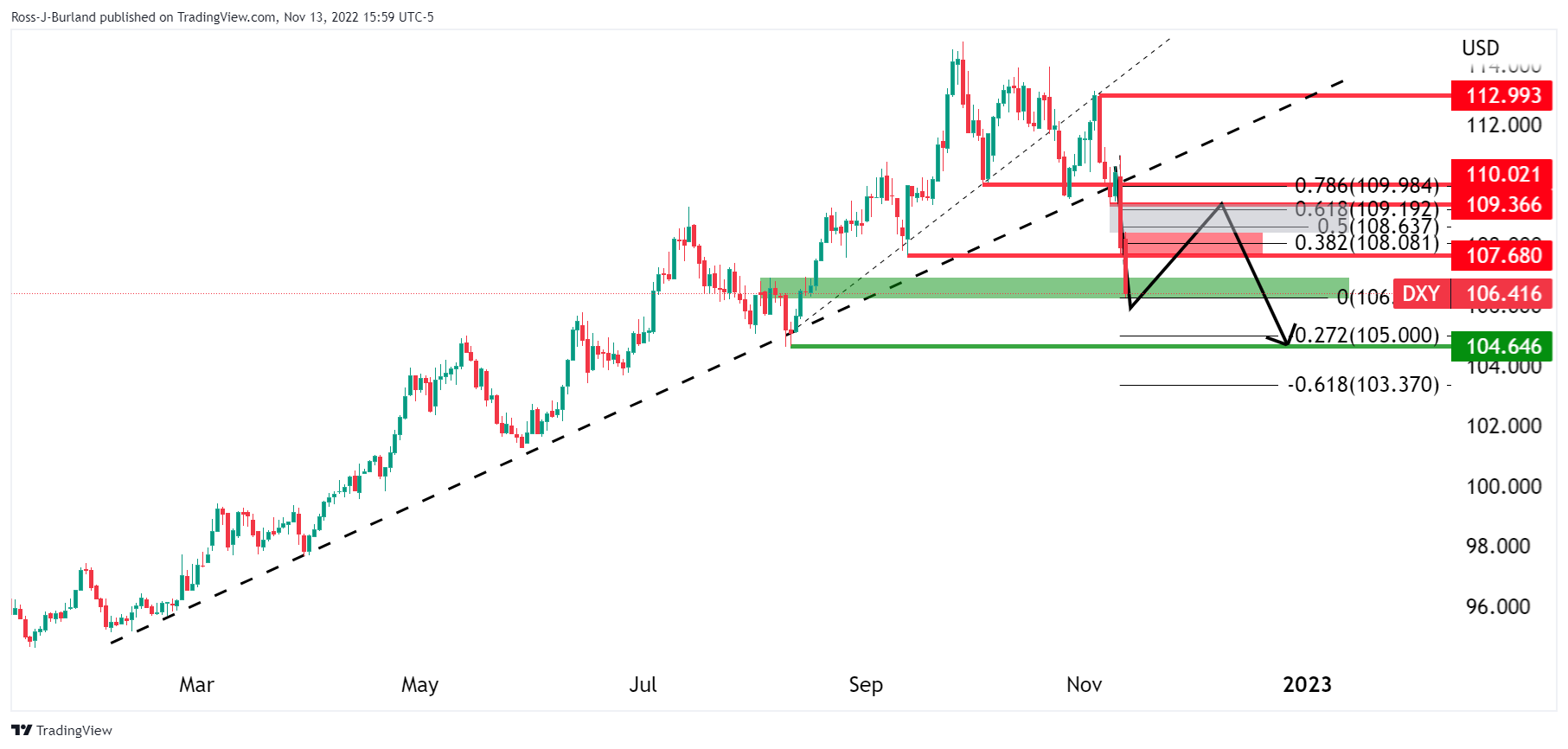 本周,美联储发言人将发表讲话,可能会对10月通胀数据公布后市场过度鸽派波动展𫔭反击。美元料将出现整理,以下分析将说明这一点。道明证券(TD Securities)的分析师认為,"官员们将明确表示,继通胀数据出现利好之后,必须出现进一步证据表明月度核心通胀正持续回落,更符合美联储关于通胀应达到2%的目标。 ”由于美国劳动力市场持续强劲,要实现这个目标可能需要一段时间。