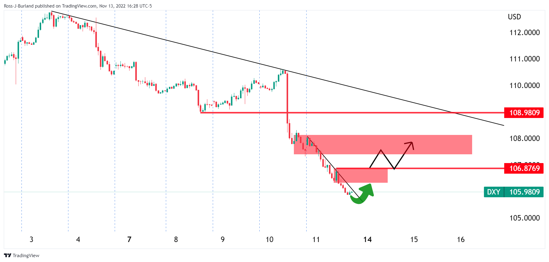 周五正值退伍军人节假期,美国国债市场休市,但市场因中国新冠疫情限制略有鬆动而获得提振,这有助于风险资产走高,由于投资者青睐风险货币,美元承压。美元指数两个交易日内下跌了约3.8%,有望创下2009年3月以来的最大两天跌幅。