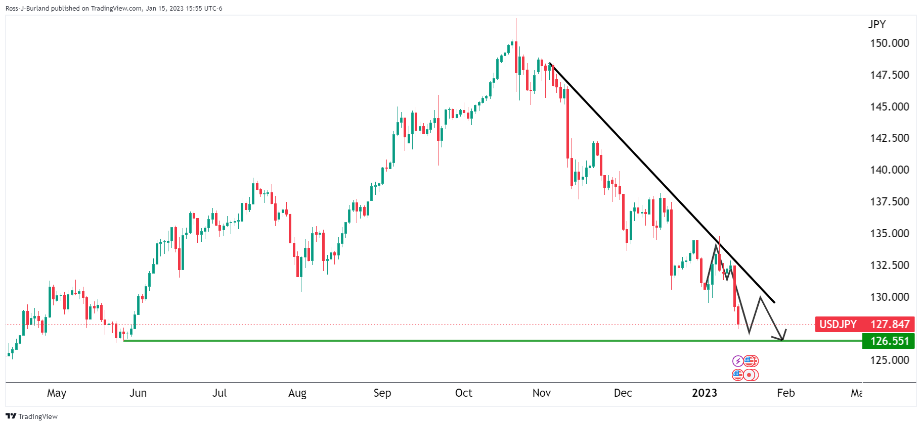 自那以后,美元/日元继续走低,目标在126.50。然而,美元/日元日缐构筑M形态,可能会提振空头,并吸引美元/日元上涨接近129.50。