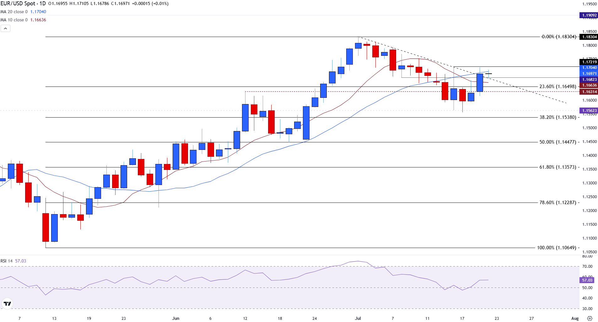 随著欧元(EUR)在对美元(USD)的长期上升趋势中保持,欧元/美元目前交易在1.1700以上。