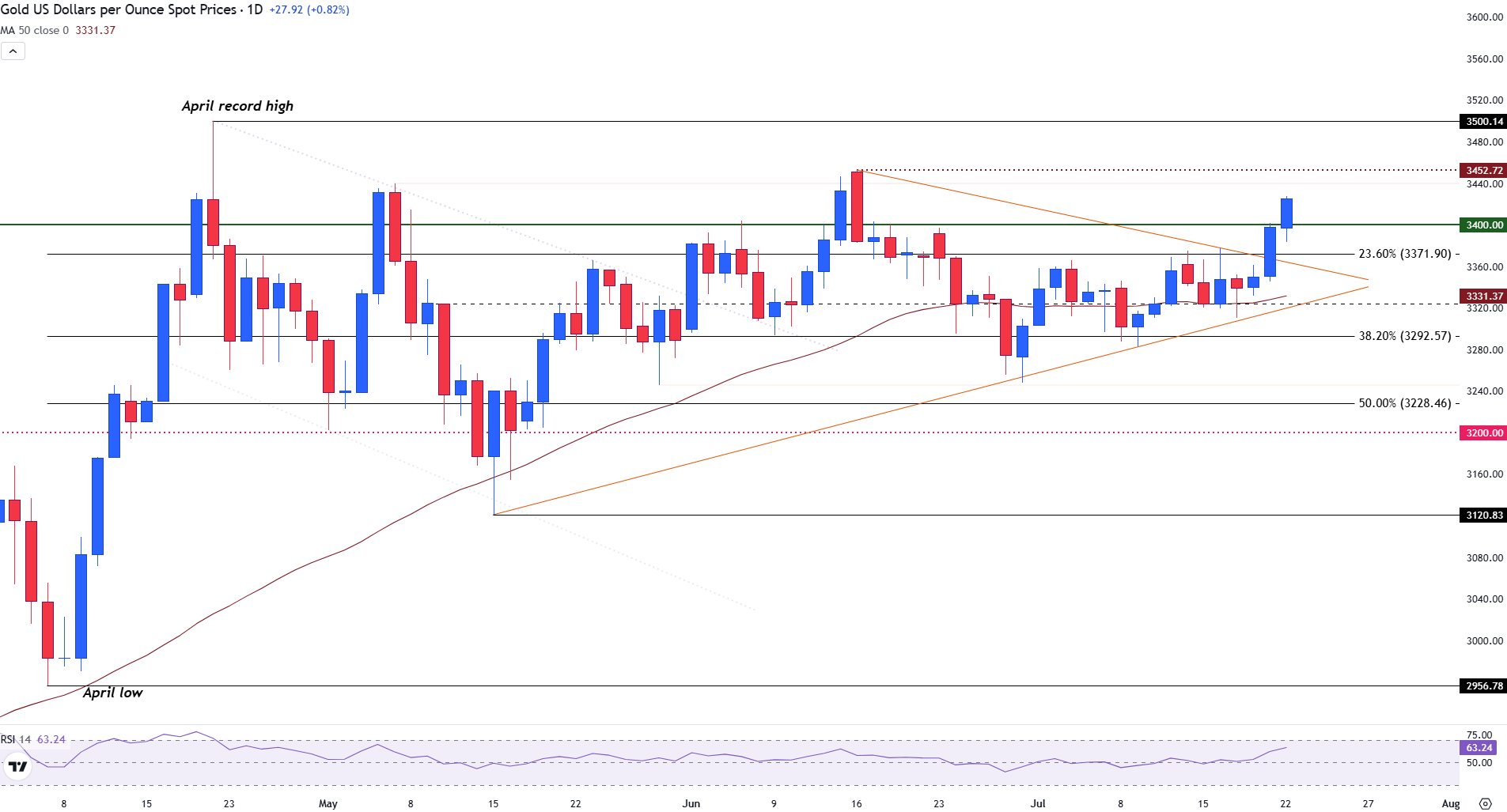 黄金(XAU/USD)已突破3400美元的阻力位,确认了近期形成的对称三角形模式的突破。