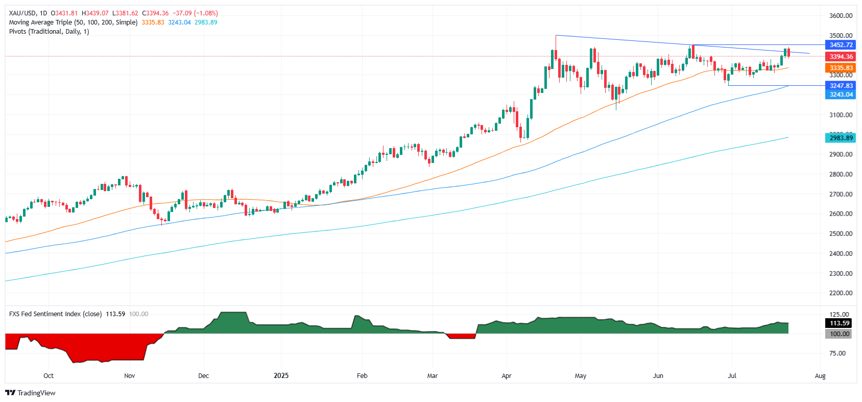 金价在美国(US)和欧盟(EU)接近簽署类似于华盛顿和东京周二簽署的协议的消息下跌至3400美元以下。因此,美元走低,為黄金提供了支撑。黄金/美元(XAU/USD)交易于3387美元,跌幅超过1.20%。