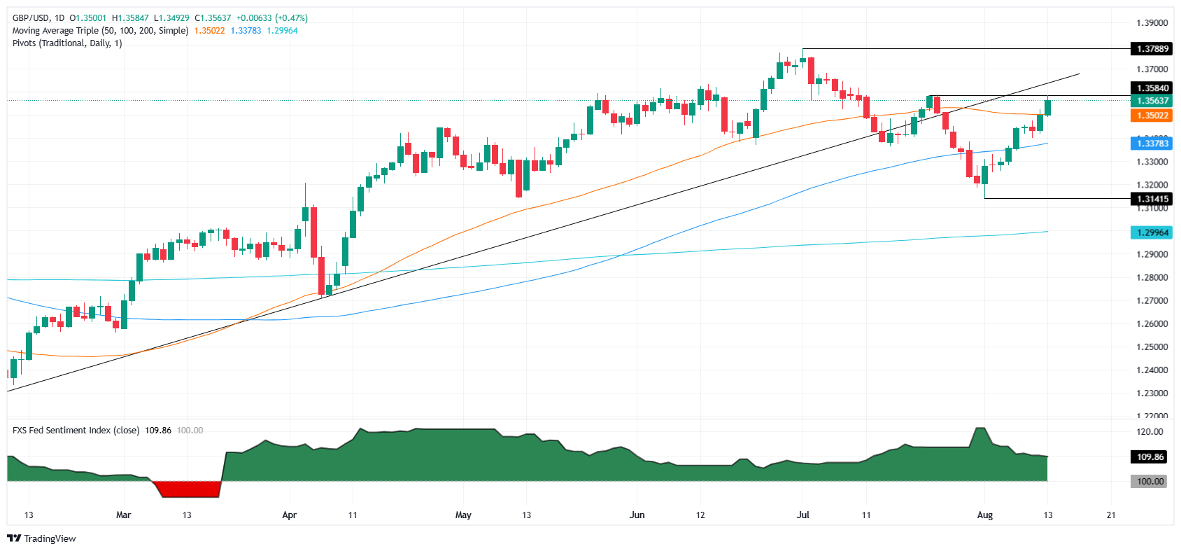 在北美交易时段,英镑/美元上涨0.56%,因美元受到打压,市场对美联储可能在9月恢复宽鬆周期的押注不断增加。该货币对在反弹至1.3572,之前触及1.3487的低点。