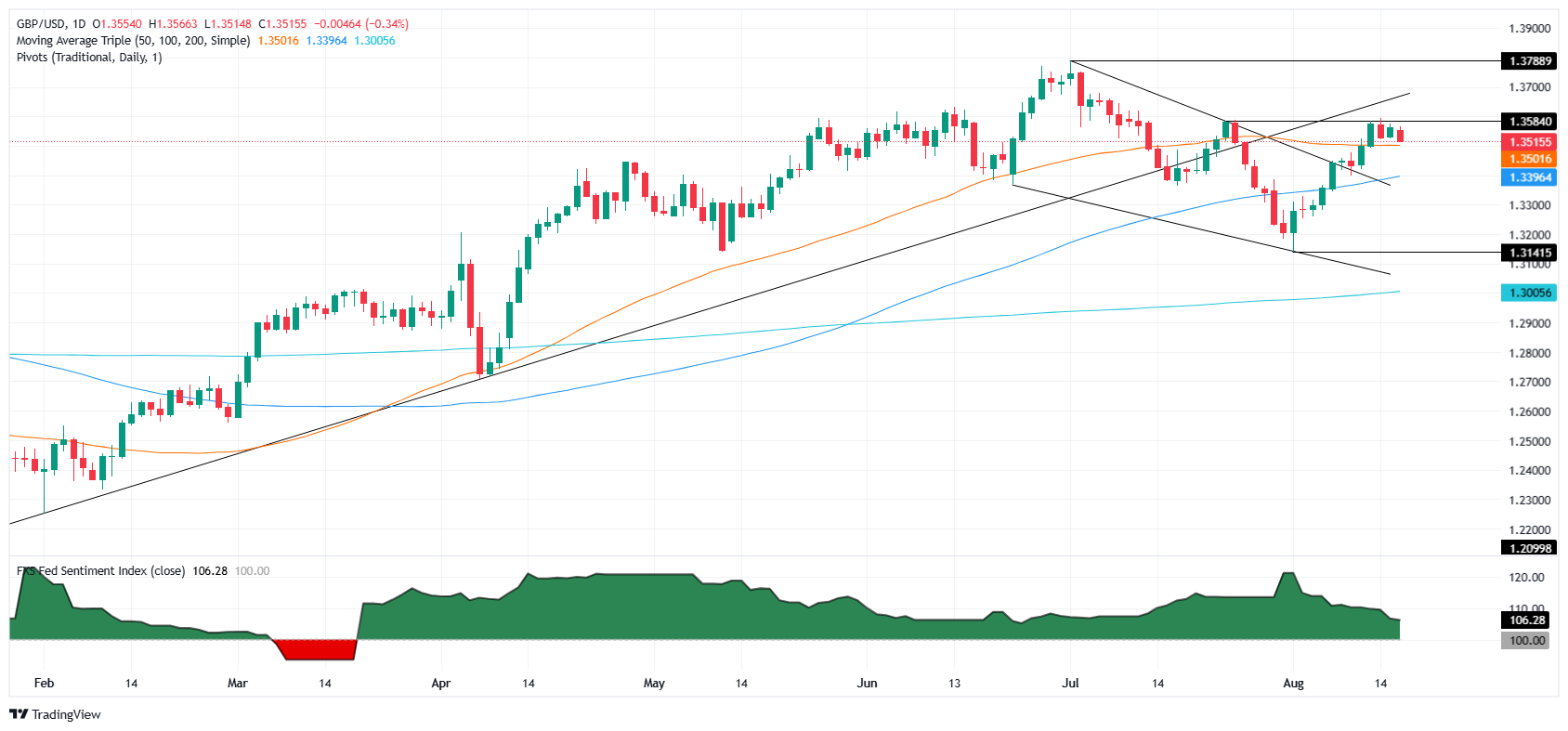 英镑/美元在北美时段保持稳定,微幅下跌0.08%,在大西洋两岸经济日程稀缺的情况下,市场参与者对特朗普-普京会议后乌克兰与俄罗斯可能达成停火或和平协议持乐观态度,并期待周一晚些时候美国总统唐纳德·特朗普与乌克兰总统弗拉基米尔·泽连斯基的会谈。截止发稿时,汇价交投于1.3540附近。