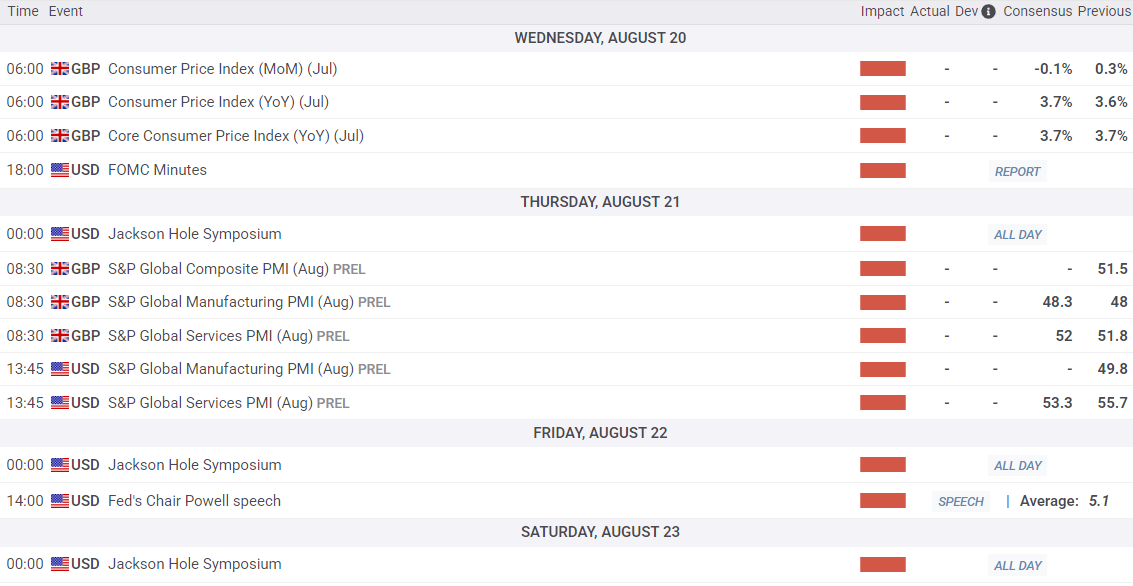 全球采购经理人指数(PMI)将在周四发布,涵盖英国和美国,而今年的杰克逊霍尔经济研讨会也将𫔭始。预计英国PMI数据在服务和製造业两个部分均会有所上升,而美国服务业PMI数据则预计会出现收缩。