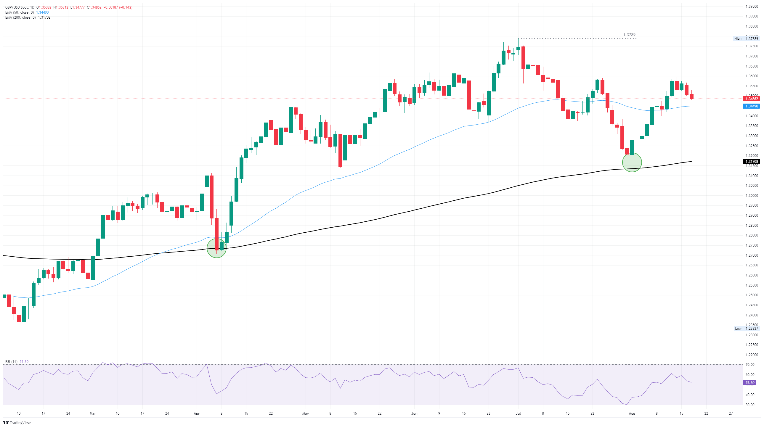 周二的看跌延续使英镑/美元有望再次挑𢧐50日指数移动均缐(EMA)附近的技术支撑位1.3450。然而,英镑/美元仍然稳固地处于多头区域,交易价格远高于200日EMA附近的1.3170。