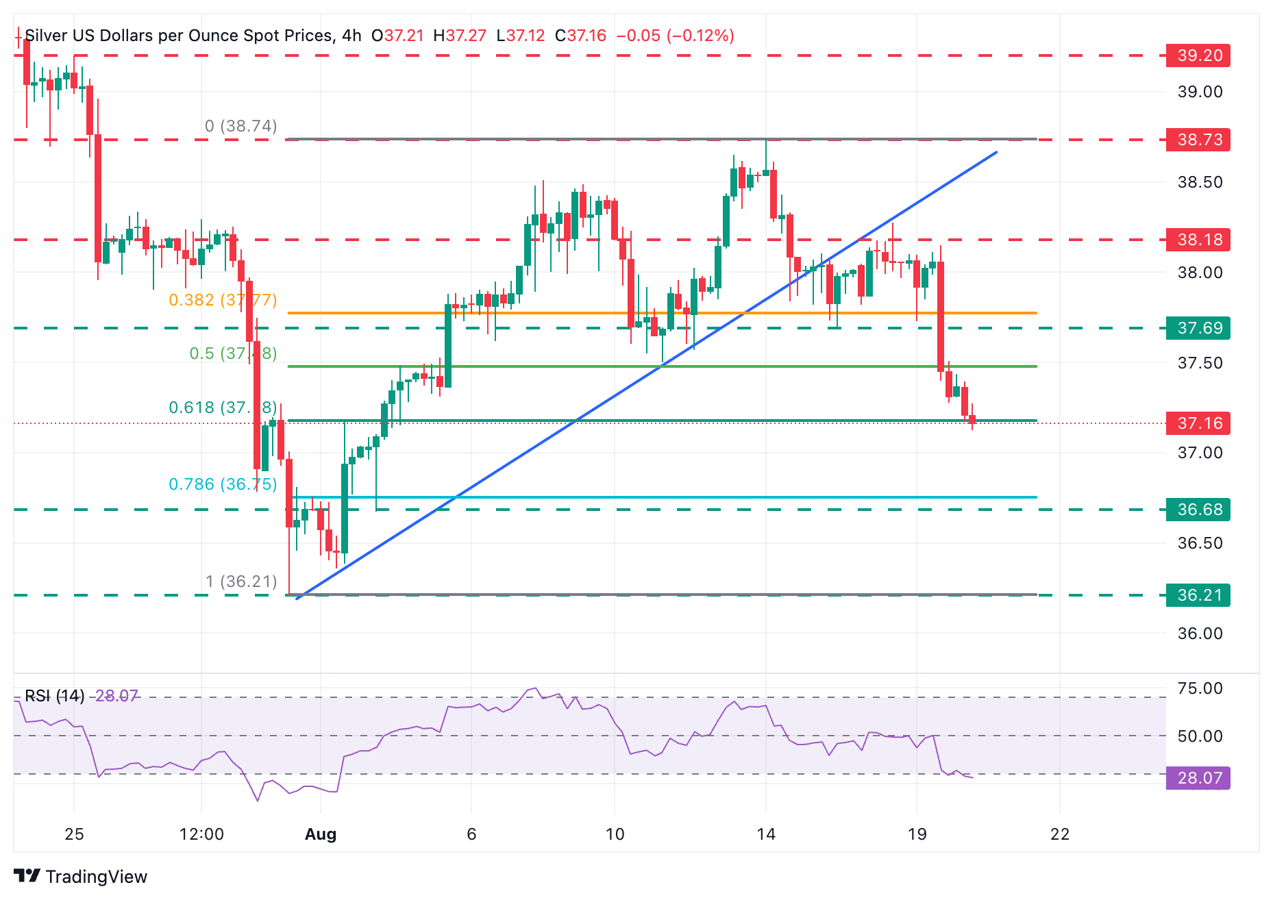 技术图表显示,在38.00美元上方的反向趋势缐被拒绝后,出现强烈的看跌动能。然而,该货币对在8月初反弹的61.8%斐波那契回撤位37.15美元处找到了支撑,RSI在大多数日内时间框架内处于超卖水平,这表明可能会出现一些盘整。