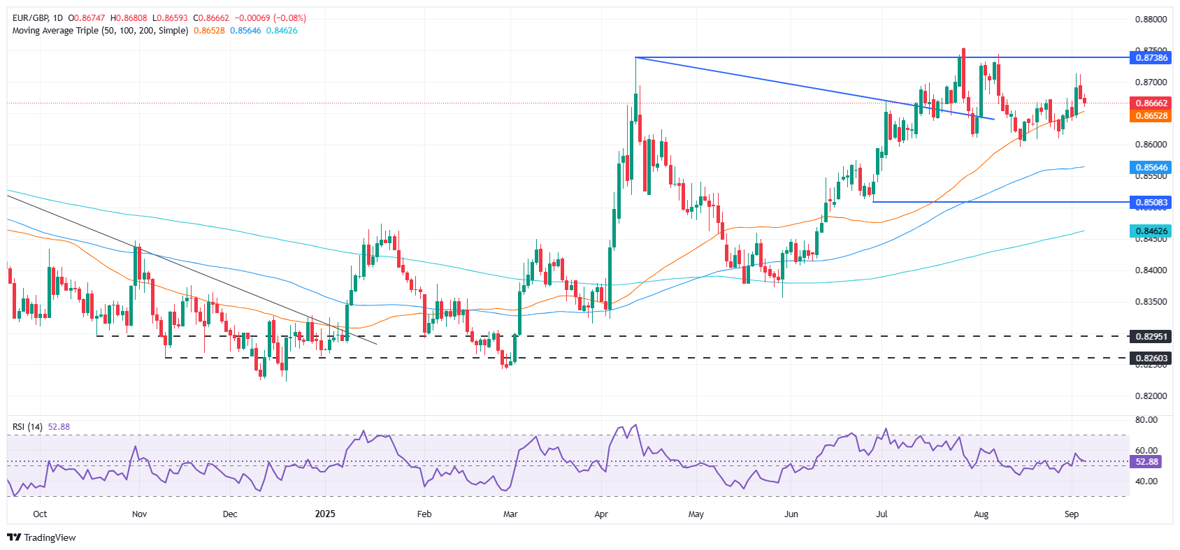 周三,欧元区的高通胀数据表明,欧洲央行(ECB)在2025年剩馀时间内不会降息。英国央行(BoE)行长安德鲁·贝利表示,利率将继续下降。因此,央行的分歧有利于欧元/英镑交叉盘的进一步上涨。