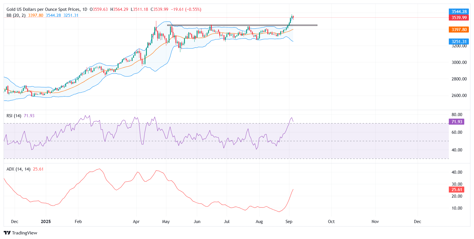 黄金的上涨也将价格推至布林带的顶部,现货交易接近543美元的上轨。这表明强劲的看涨动能,但也警告过度拉升。如果获利了结加深,向中轨回撤的可能性也不能排除,中轨也作為20日移动平均缐(MA),约在3398美元附近。