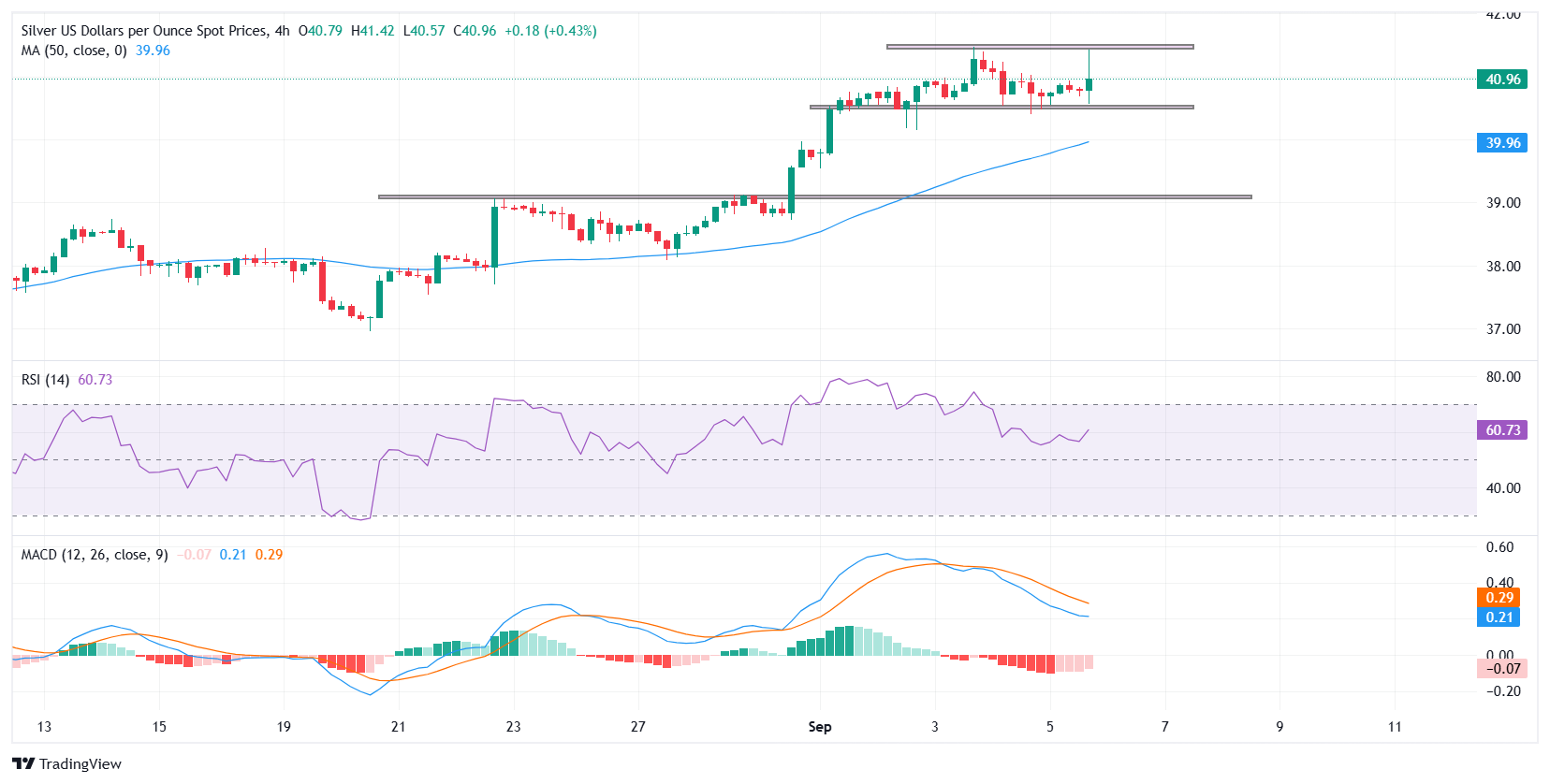 周五,白银(XAG/USD)在41.00美元附近保持坚挺,此前在疲软的美国非农就业数据发布后重新测试了多年的高点。该金属周三触及41.47美元,為2011年9月以来的最高水平,随后在周四略微回落。由于美国美元(USD)普遍走弱以及国债收益率在令人失望的就业报告后下跌,新的𧹒入兴趣正在升温,市场现在越来越相信美联储(Fed)将在本月晚些时候降息。
