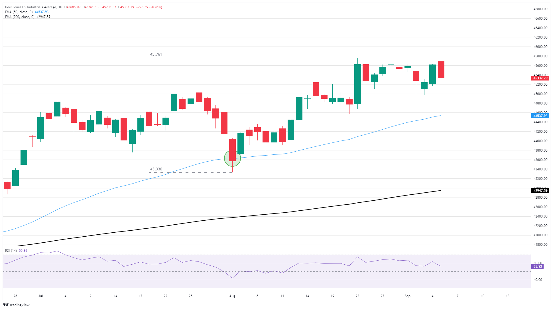 道琼斯工业平均指数(DJIA)在周五下跌,最低时下跌近500点,此前美国(US)非农就业数据(NFP)显示新增就业岗位远低于预期,令市场对美联储(Fed)在9月17日降息的预期加大。