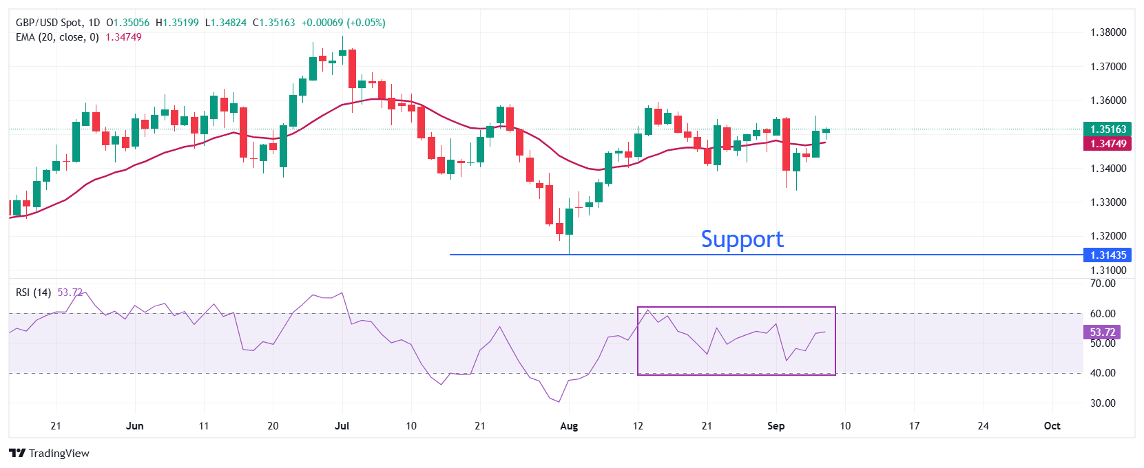 周一,英镑兑美元小幅上涨至接近1.3515,但仍在周五的交易区间内。英镑/美元的短期趋势横盘整理,交易在20日指数移动平均缐(EMA)附近,约為1.3475。
