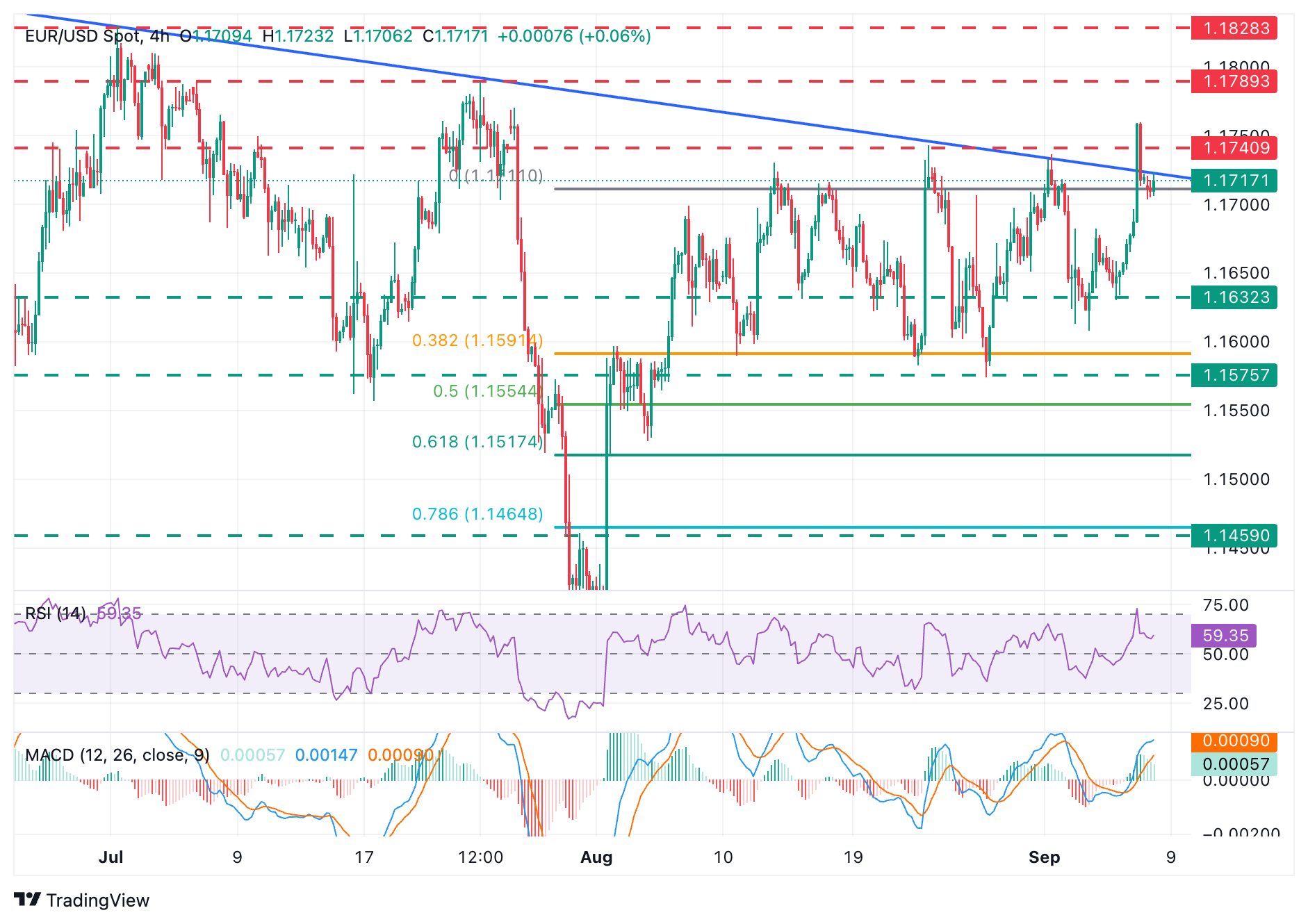 EUR/USD显示出改善的技术面。4小时相对强弱指数(RSI)在59的看涨区域内,MACD也在看涨区域,但在1.1720和1.1740之间的阻力区域可能难以突破。