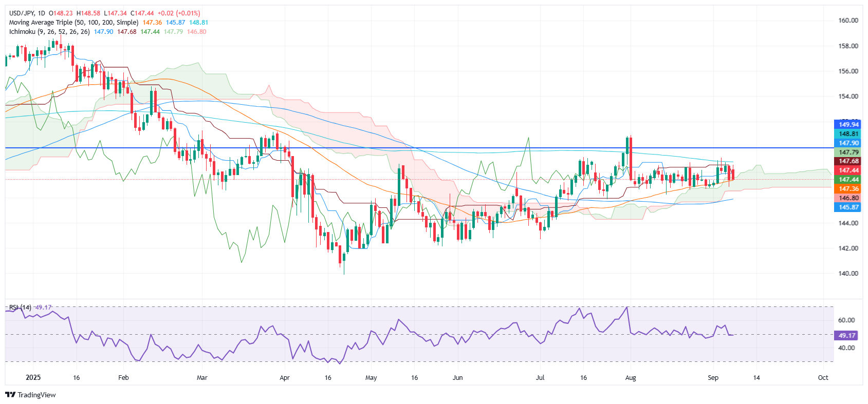 美元/日元在147.50水平下方保持稳定,但由于市场参与者预期美联储将在9月会议上降息,录得微小的0.02%损失。