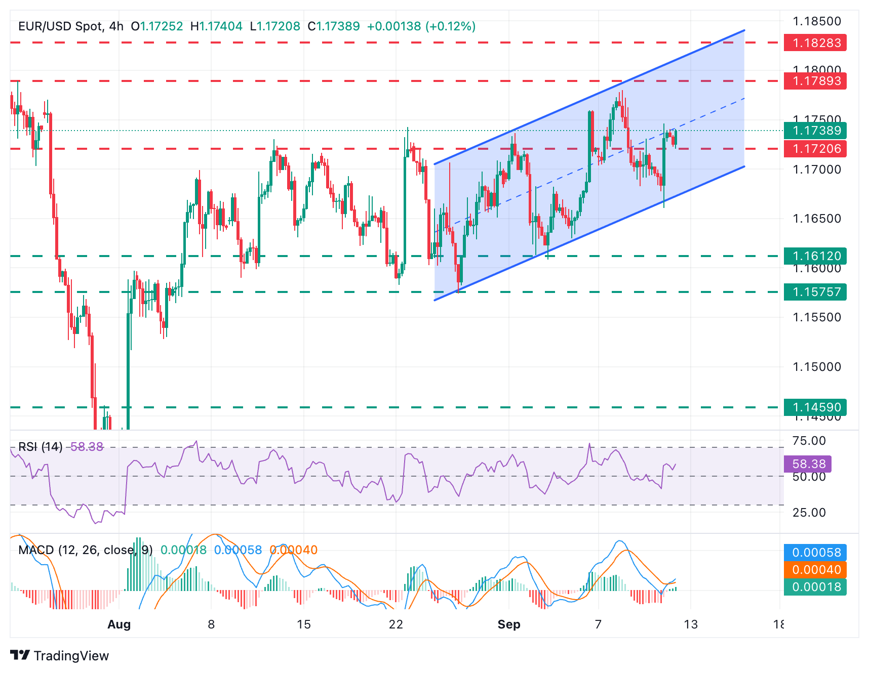 向下方面,1.1720水平目前限制了下行尝试。低于此水平,通道底部在1.1670,正好在周四的低点1.1660之上。突破该水平将取消看涨观点,并增加对9月2日和3日低点1.1610区域的压力。