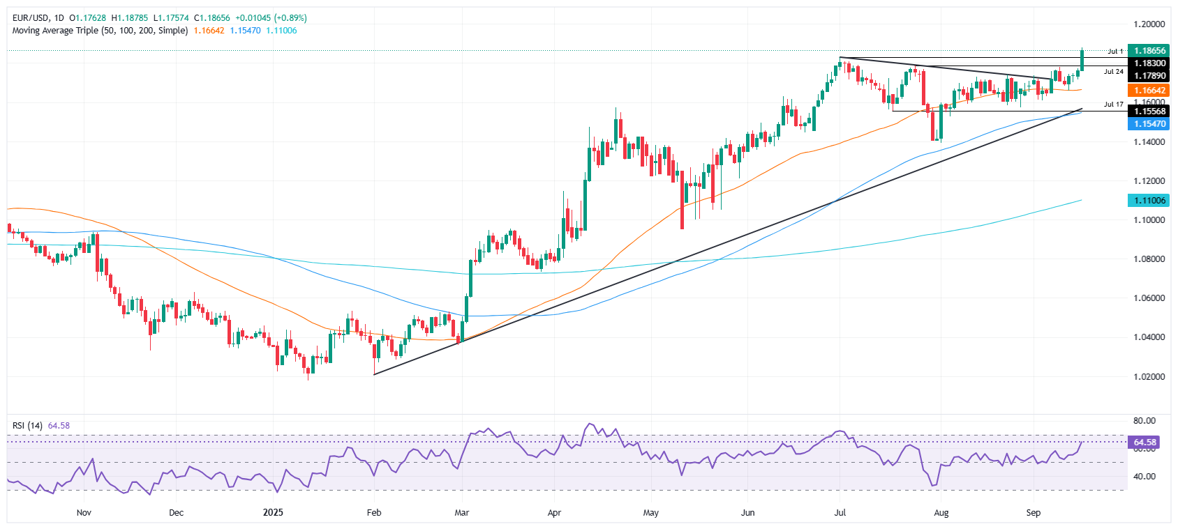 由于投资者抛售美元,增加了美联储本周将恢复宽鬆周期的押注,欧元/美元周二上涨至1.1878,创下四年新高。该货币对在撰写时交易于1.1865,涨幅接近0.90%。