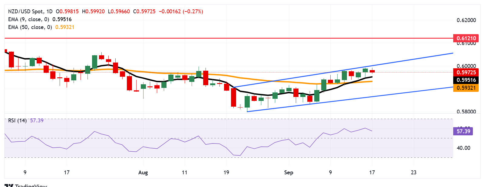 周三欧洲时段,纽元/美元在经历两天的上涨后贬值,交易价格约為0.5970。日缐图的技术分析显示出看涨偏向的增强,因為该货币对在上升通道模式内向上移动。