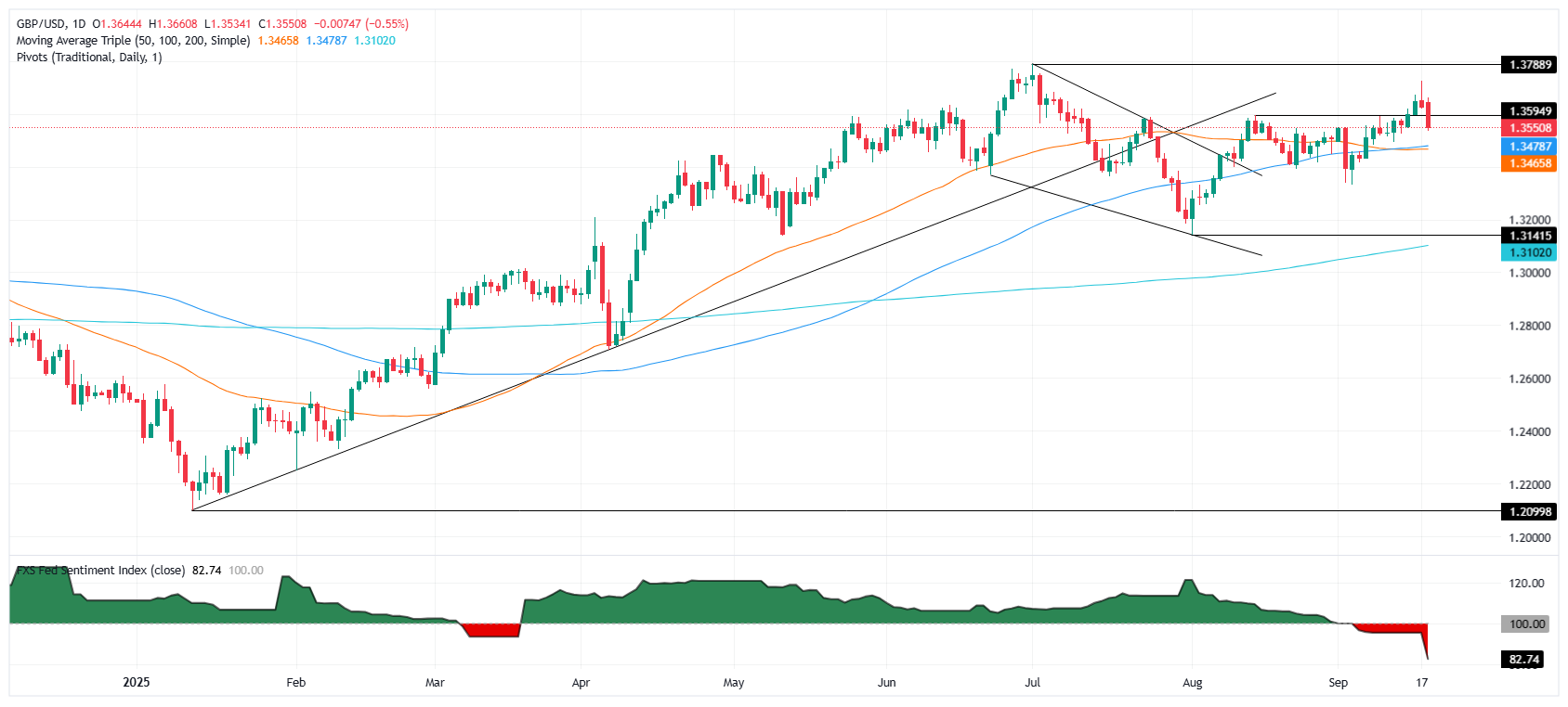 英镑逆转方向,因英国央行决定维持利率不变,且美联储𫔭始其2025年宽鬆周期,英镑/美元下跌超过0.51%。当前英镑/美元交投于1.3551,此前曾触及日高1.3660。