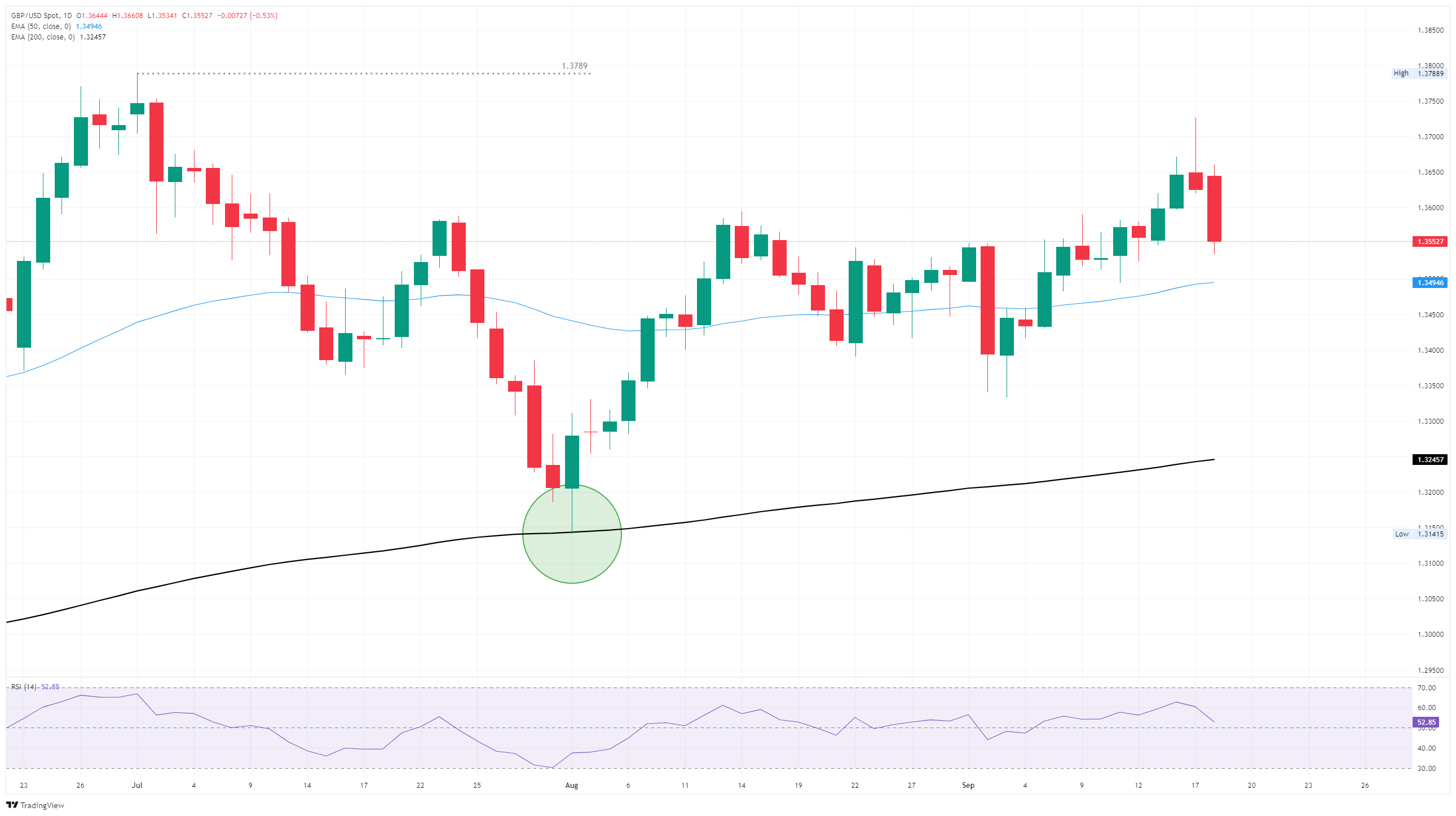 英镑/美元周四大幅下跌,跌幅略超过0.5%,将英镑(GBP)推回至关键的1.3600关口以下,因在主要技术水平上方短暂波动后回落。