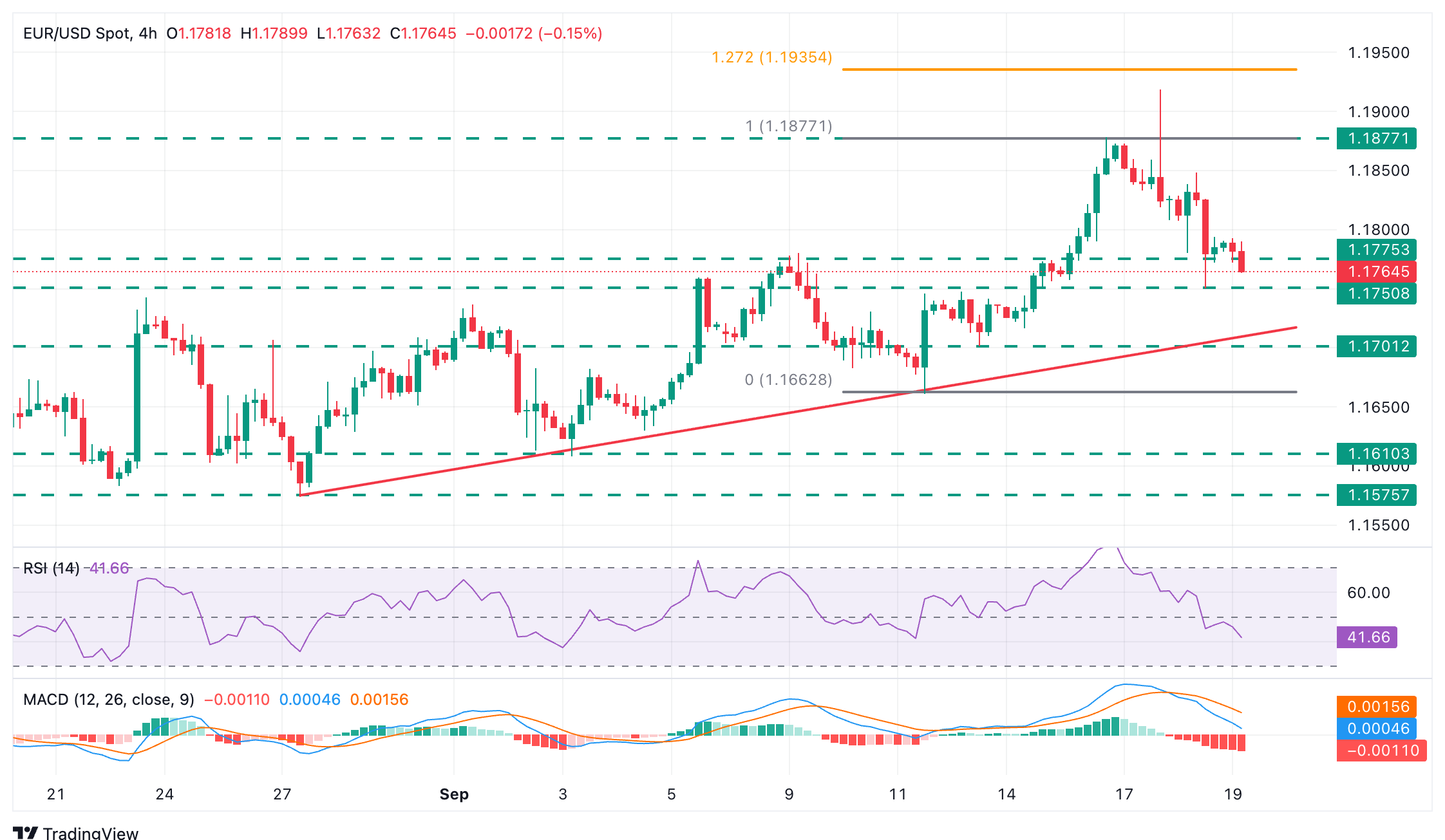 在更强的美元背景下,欧元/美元正在加速从四年高点回落。技术指标显示出日益增强的看跌动能,4小时图上的相对强弱指数(RSI)在50水平以下整理,空头关注1.1750-1.1760支撑区域,该区域在9月15日和18日的下行尝试中保持了支撑。