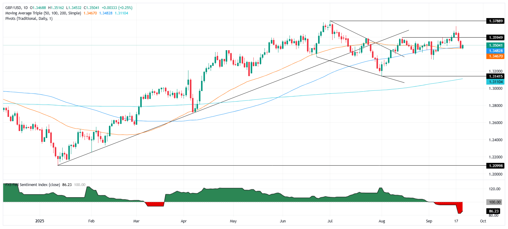 侭管GBP/USD正在上涨,但在1.3520的20日简单移动均缐(SMA)处面临阻力。如果未能在1.3500以上结束当天交易,可能会延续短期下行趋势,测试1.3400,空头关注下一个关注区域1.3332,即9月3日的波动低点。