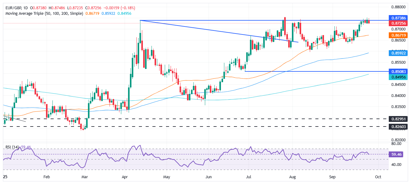 也就是说,如果EUR/GBP跌破0.8700,下一支撑位将是0.8686的20日简单移动平均缐(SMA),然后是0.8671的50日SMA。相反,如果𧹒方重新夺回0.8750,下一关注区域将是0.8800。