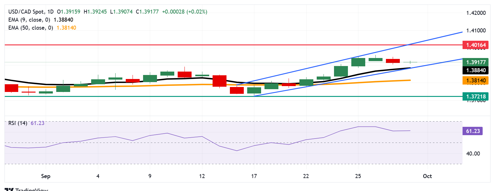 周二欧洲时段,美元/加元在1.3910附近交易,在前一交易日录得亏损后保持稳定。日缐图的技术分析表明,该货币对仍处于上升通道模式中,表明存在持续的看涨偏向。