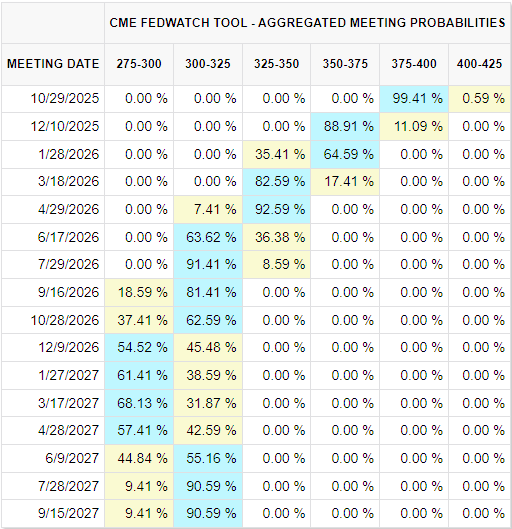 由于NFP数据面临风险,投资者更加依赖ADP等私人数据。根据CME的FedWatch工具,交易员对10月29日再降25个基点的押注在周三ADP发布后飙升至99%。利率市场还预计12月10日将有近90%的概率进行第三次连续降息,并且到明年4月之前,美联储将进行第四次降息的概率高达93%。