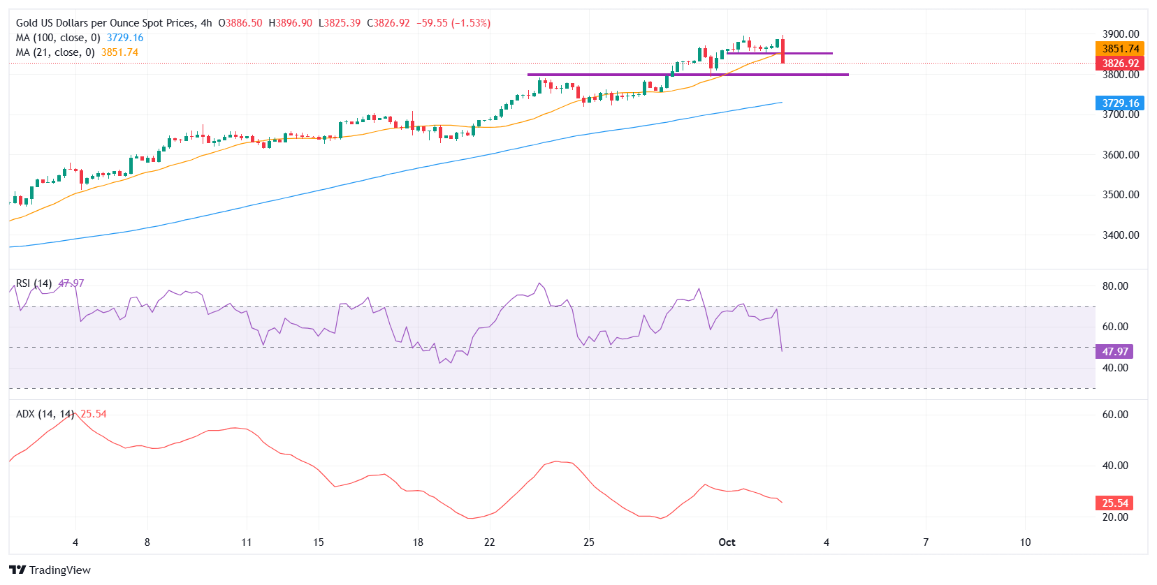 黄金(XAU/USD)在周四以负偏向交易,削减了近期的涨幅,此前在周三创下近3895美元的历史新高。截至发稿时,XAU/USD在美国交易时段交投于约3820美元,较之前短暂重测纪录高点下跌超过1.0%。