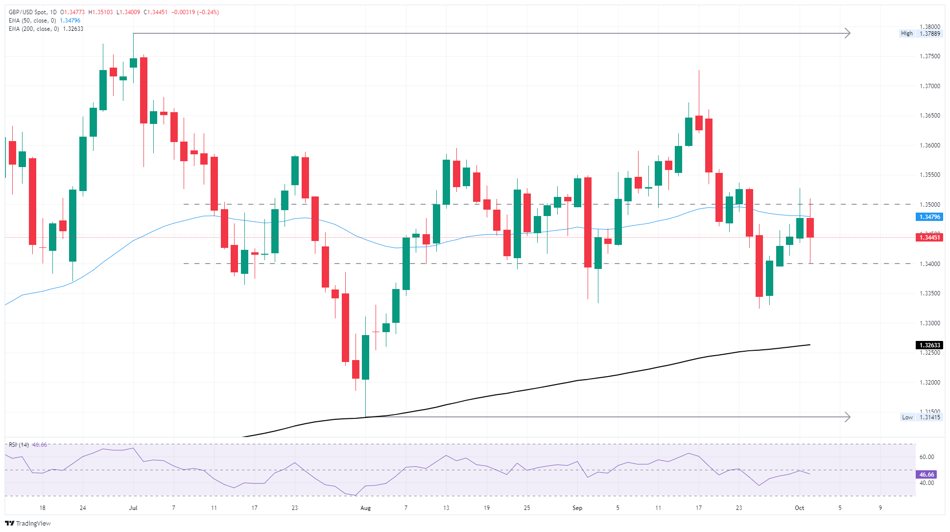 英镑/美元在周四回落,结束了四个交易日的上涨势头,并从1.3500关口的技术性拒绝中大幅下跌。英镑/美元正在从1.3400到1.3500的中期整合中回落,价格走势顽固地保持在50日指数移动均缐下方。市场在动能上延长了暂停,投资者在权衡美国政府的联邦停摆将持续多久以及可能产生的经济影响。